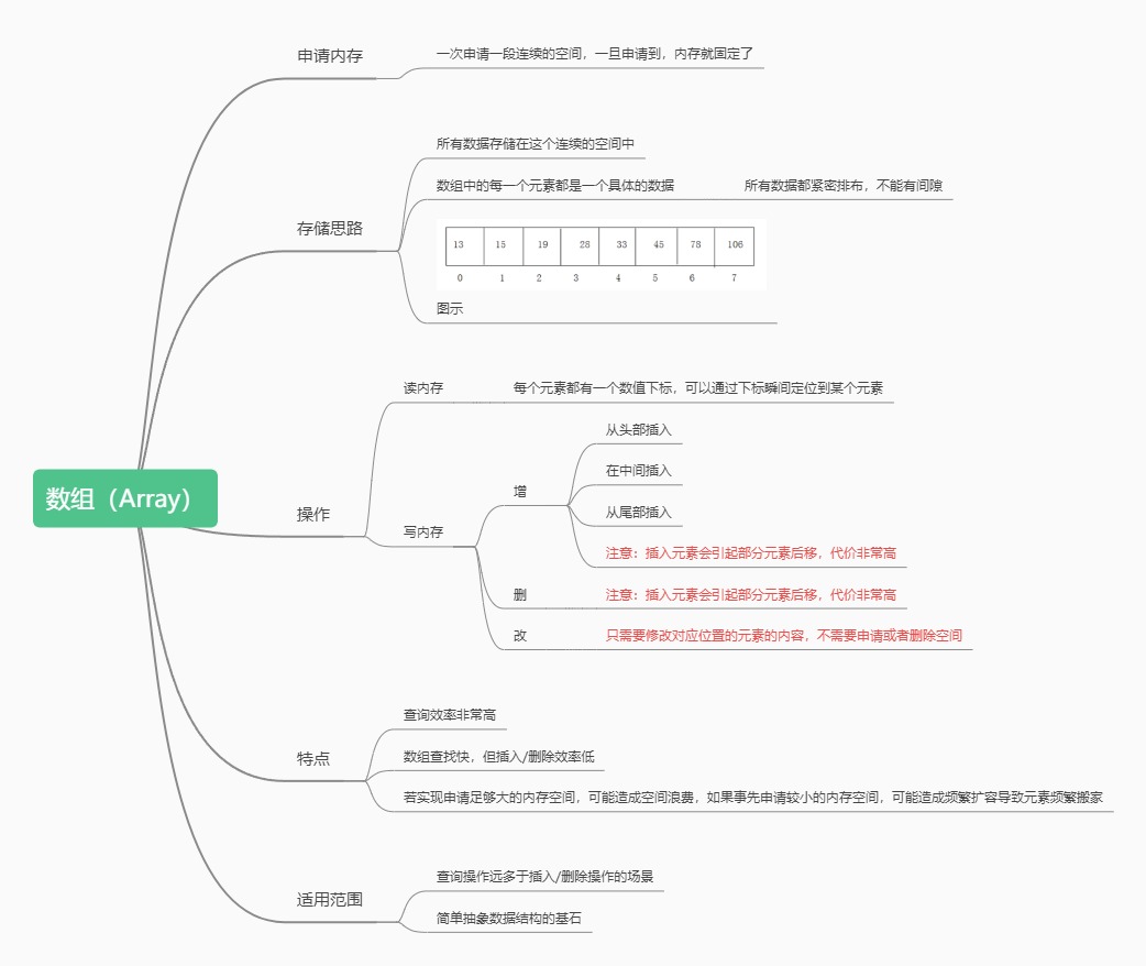 • 存储特点:所有数据存储在这个连续的空间中,数组中的每一个元素都是一个具体的数据(或对象),所有数据都紧密排布,不能有间隔