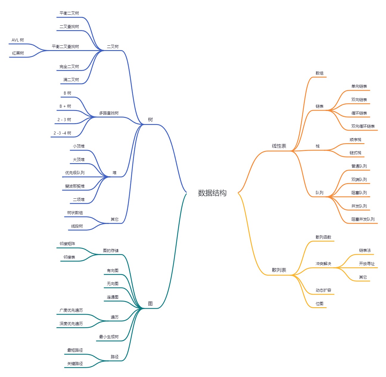 • 图形结构:数据结构中的元素存在“多对多”的相互关系。比如全国铁路网、地铁图