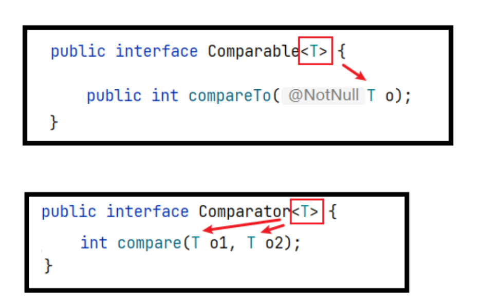 java.lang.Comparable 接口和 java.util.Comparator 接口,是用于比较对象大小的接口。 这两个接口只是限定了当一个对象大于另一个对象时返回正整数,小于返回负整数,等于返回 0,但是并不确定是什么类型的对象比较大小。 JDK5.0 之前只能用 Object 类型表示,使用时既麻烦又不安全,因此 JDK5.0 给它们增加了泛型。