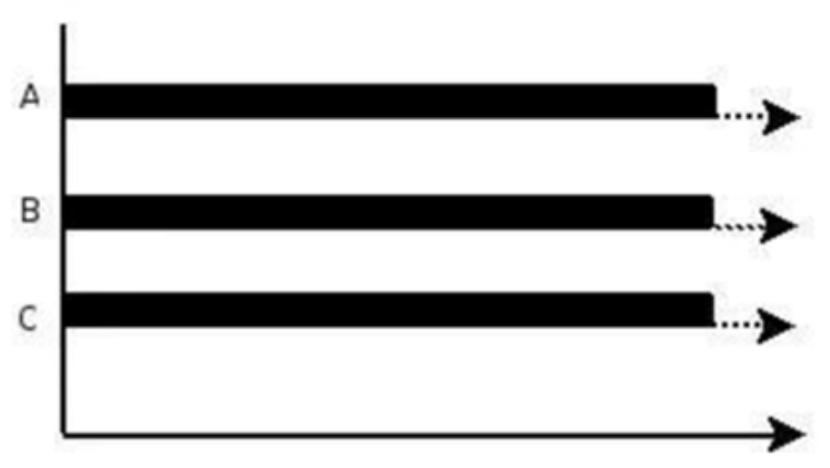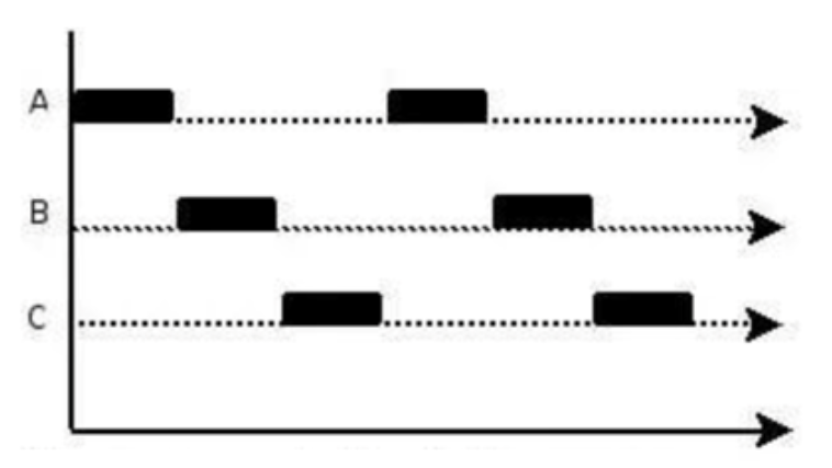 • 并发(concurrency):指两个或多个事件在同一个时间段内发生。或者说在一段时间内,有多条指令在单个 CPU 上快速轮换、交替执行,使得在宏观上具有多个进程同时执行的效果。