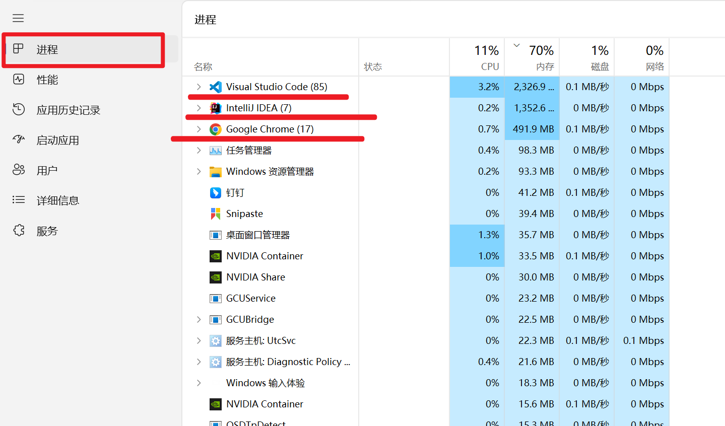 每个应用程序的运行都是一个进程。运行多个应用程序就有多个进程。