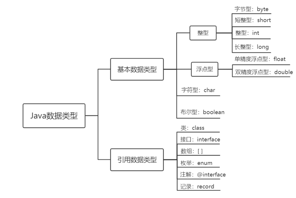 • 引用数据类型:包括数组、类、接口、枚举、注解、记录、字符串。