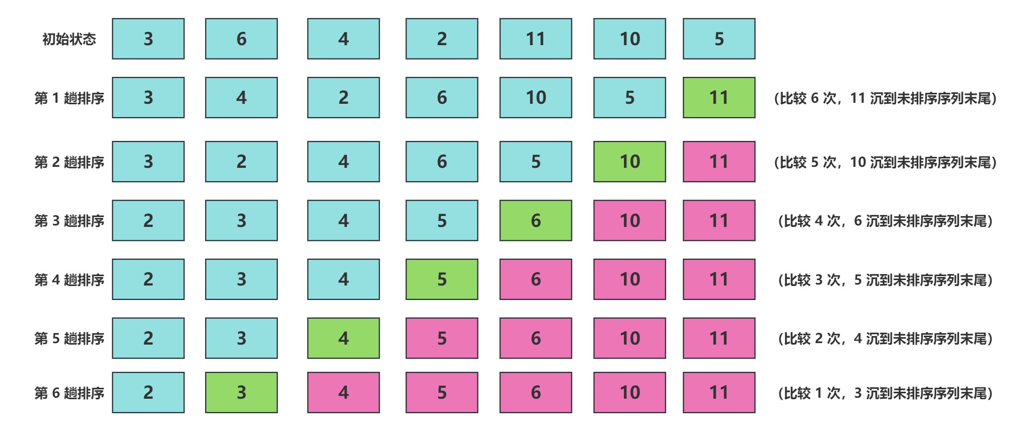 - 持续每次对越来越少的元素重复上面的步骤,直到没有任何一对数字需要比较为止。
