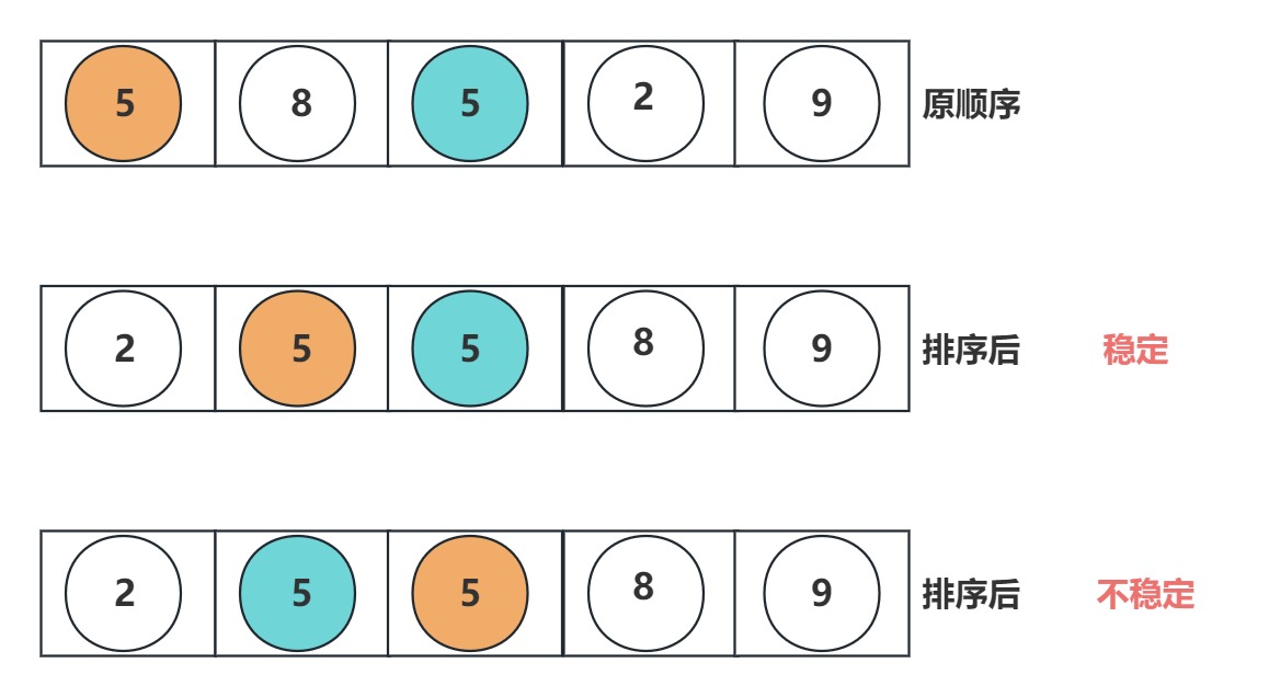 稳定性:若两个记录 A 和 B 的关键字值相等,但排序后 A、B 的先后次序保持不变,则称这种排序算法是稳定的